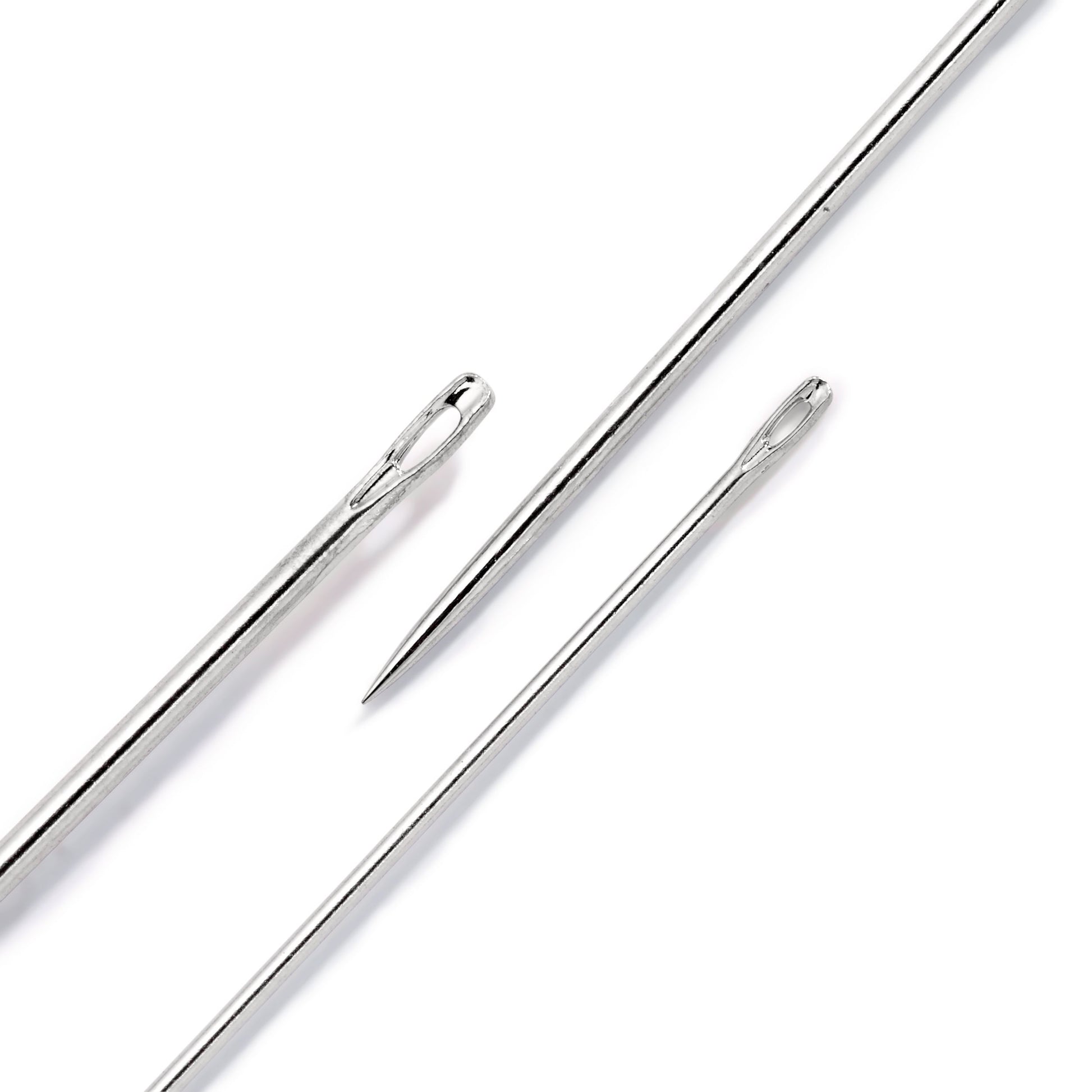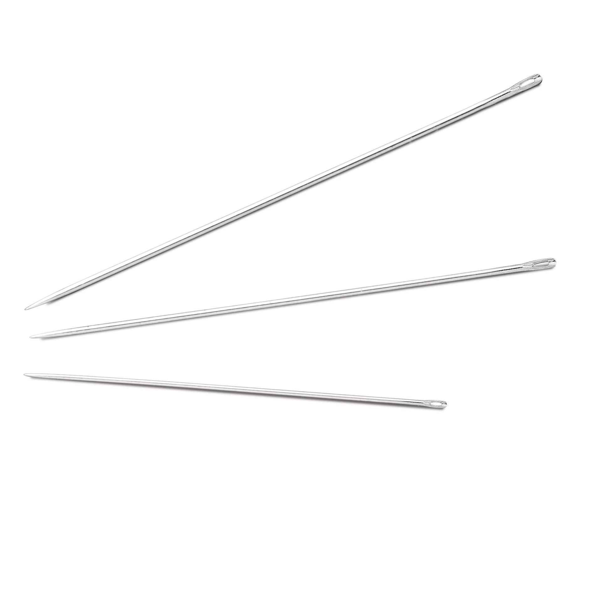 Millinery needles are comparatively longer than conventional hand sewing needles and are exceptionally suited for sewing firmer material such as in costume-making and millinery. Due to the fact that the stitches must generally be applied as invisibly as possible, this application requires a fine and long needle. These needles are made of hardened steel and have a burr-free embossed eye. Their fine, polished tip and the evenly-coated surface slide well through the material, while the balanced spring stiffness ensures ideal use elasticity.
