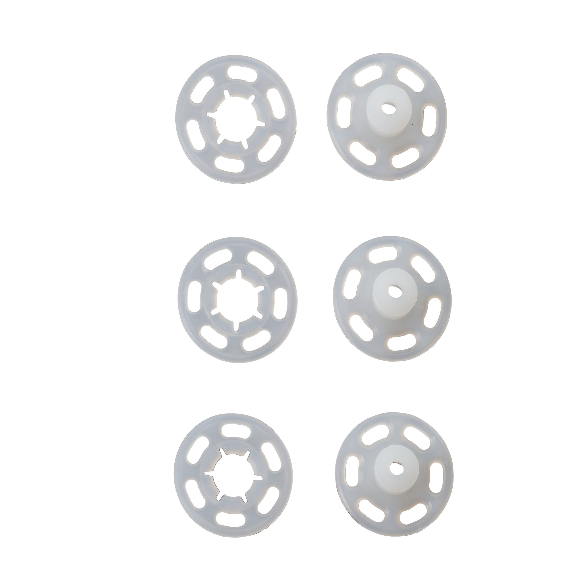 These plastic sew-on snap fasteners are absolute all-rounders, because they are ideal for clothing, and they are also valuable aids in the home, for craft work or when camping. They are made from high quality, unbreakable plastic and their light weight makes them especially suitable for light clothing or even baby clothing. Because they are transparent, they are the perfect solution for bed linen or pillows - in fact for everywhere, where snap fasteners should not be visible. Four slots on each snap fastener ensure that the snap fasteners can be securely sewed on. They can be washed at temperatures of up to 95 degrees and are available in a variety of sizes. The number of plastic sew-on snap fasteners in a packet varies depending on size.